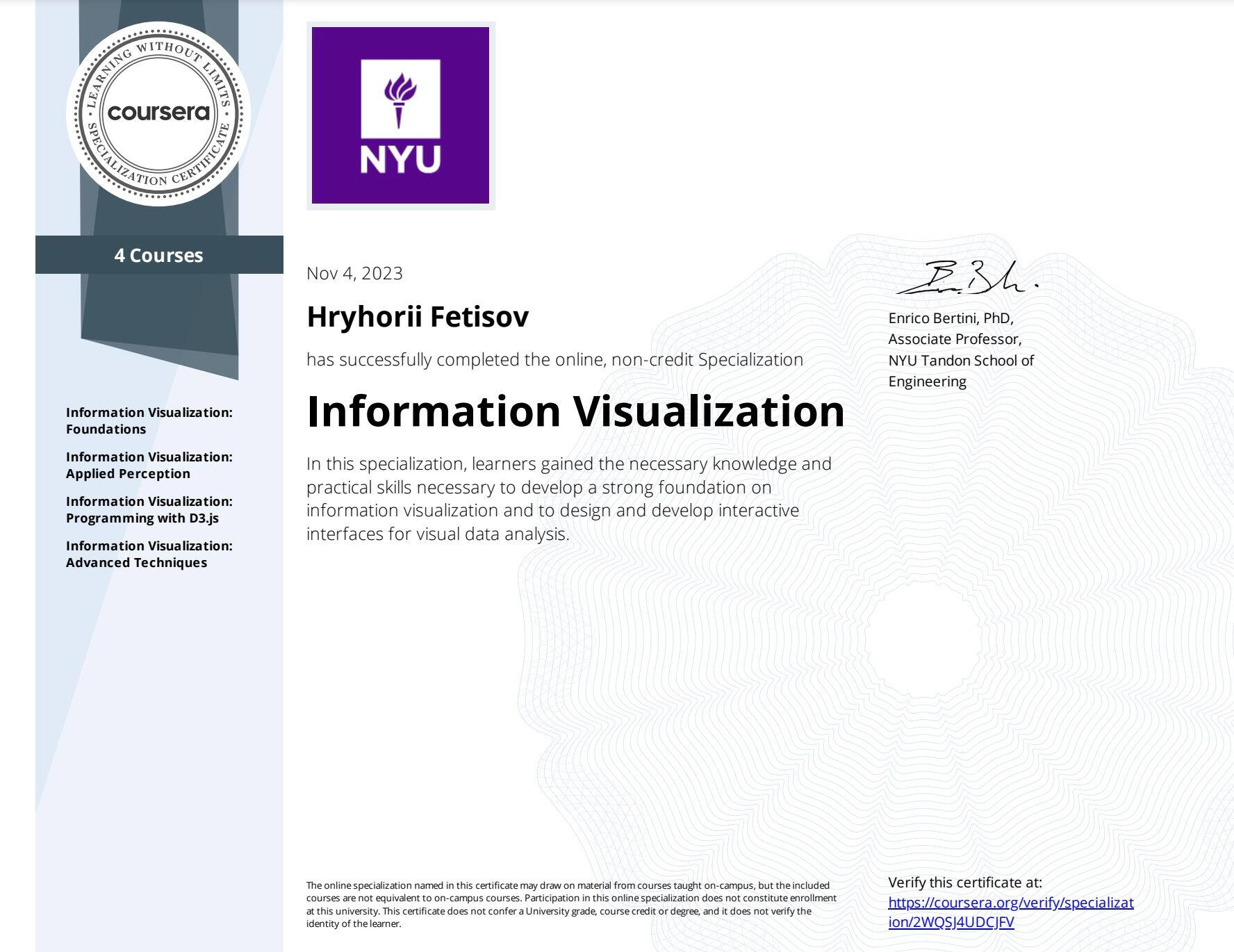 My completion of the 'Information Visualization' Specialization from New York University Tandon School of Engineering, via Coursera equips me with unique skills that directly benefit your dashboards. This feature of my professional profile means you're getting more than just data analysis; you're getting data storytelling shaped by NYU's cutting-edge practices.